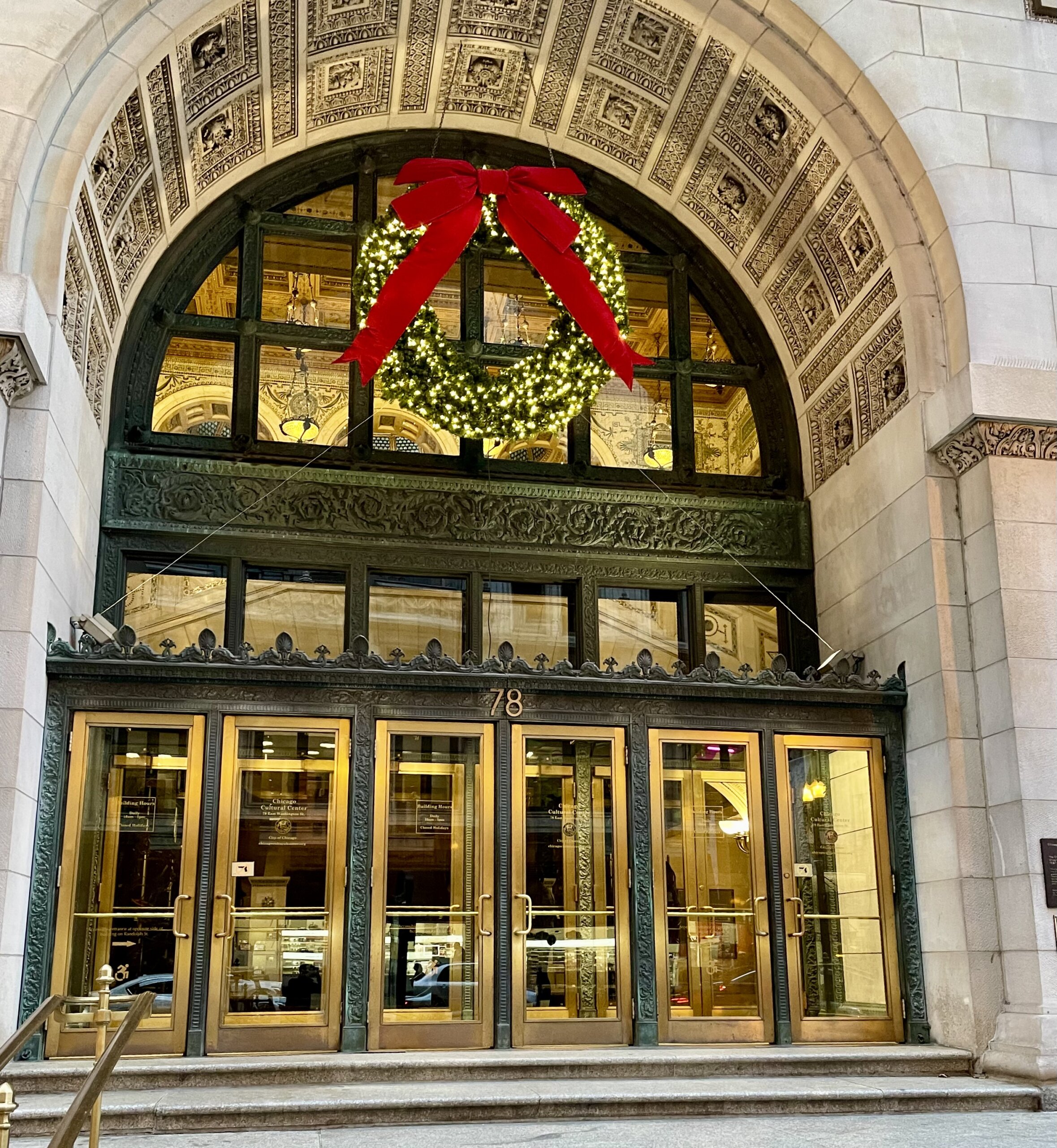 A quick train ride to the other side of the Loop takes us to Wabash and Adams where we stroll past the origin/terminus of Route 66, enjoy the Art Institute’s lion statues wearing festive holiday wreaths, and journey through one last stretch of Pedway to Millennium Park to view the official Christmas Tree of the City of Chicago, as well as the famous Cloud Gate sculpture, aka, The Bean.